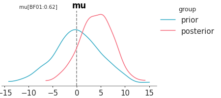 >>> from arviz_plots import plot_bf, style >>> style.use("arviz-variat") >>> from arviz_base import load_arviz_data >>> dt = load_arviz_data('centered_eight') >>> plot_bf(dt, var_names="mu", kind="hist")